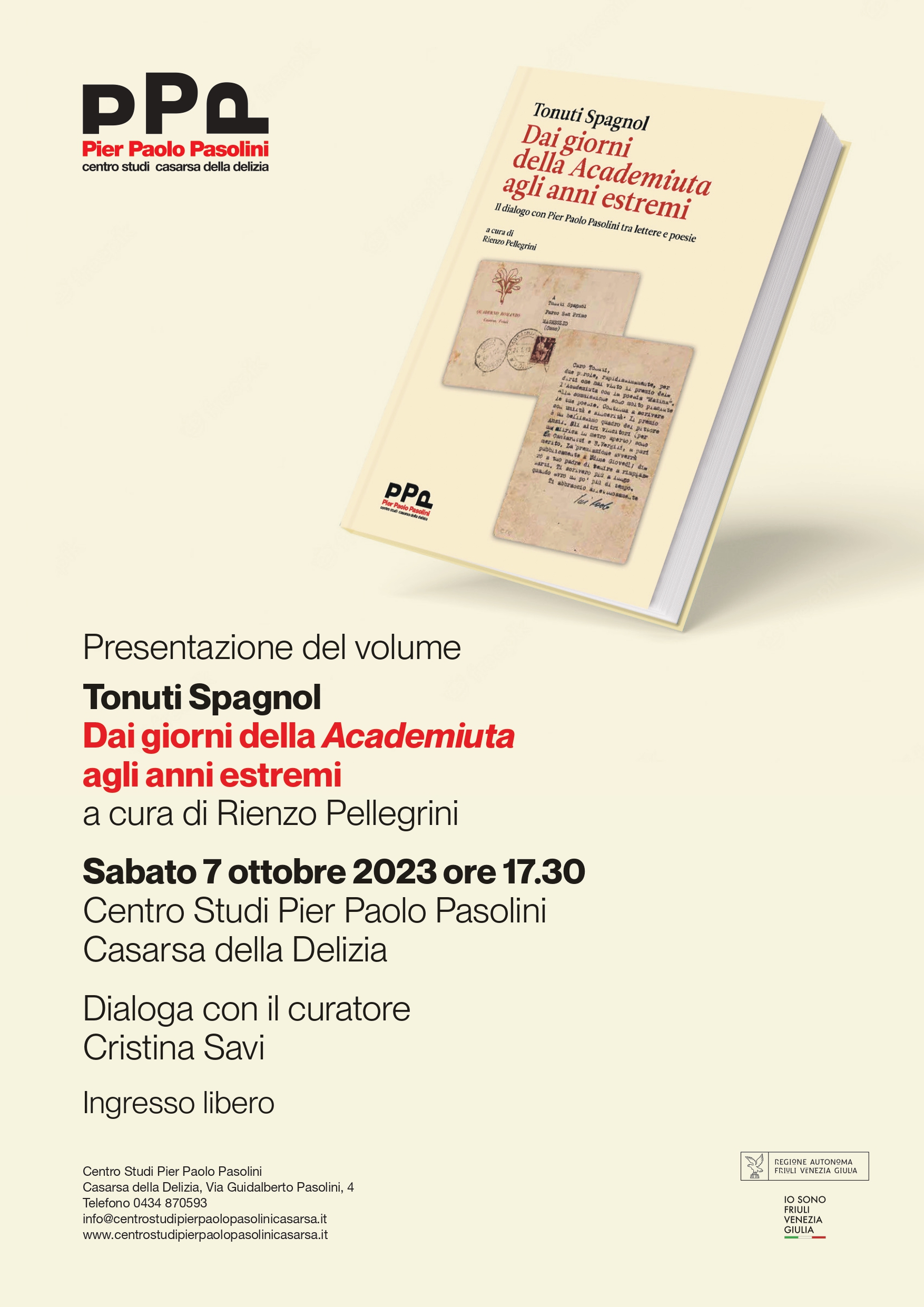 Sabato 7 ottobre alle 17.30 al Centro Studi Pier Paolo Pasolini di Casarsa verrà presentato in anteprima il libro “Tonuti Spagnol. Dai giorni dell’Academiuta agli anni estremi. Il dialogo con Pier Paolo Pasolini tra lettere e poesie”, a cura del prof. Rienzo Pellegrini.