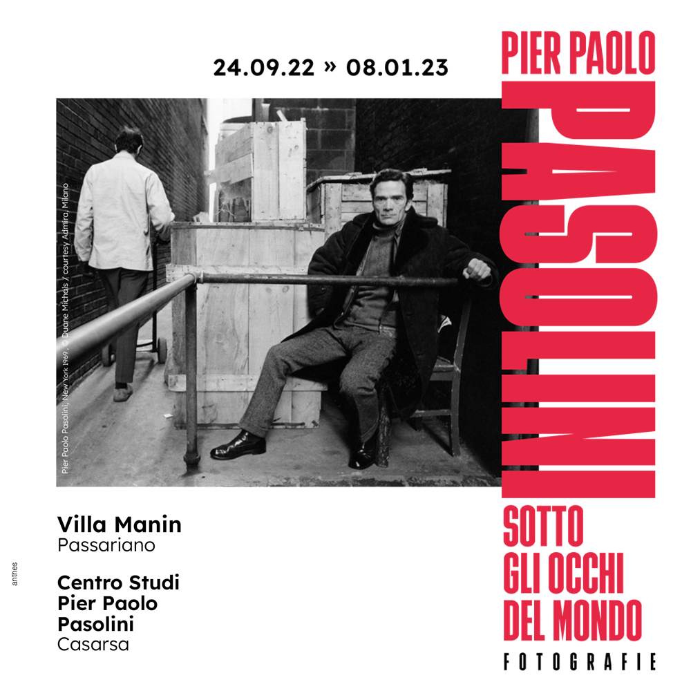 Dal 24 settembre 2022 a Villa Manin di Passariano e al Centro Studi Pier Paolo Pasolini di Casarsa saranno visitabili le due sezioni della mostra Pier Paolo Pasolini. Sotto gli occhi del mondo, curata da Silvia Martín Gutiérrez, e promossa dall’ERPAC – Ente Regionale per il Patrimonio Culturale del Friuli Venezia Giulia – in occasione del centenario dalla nascita del grande intellettuale.