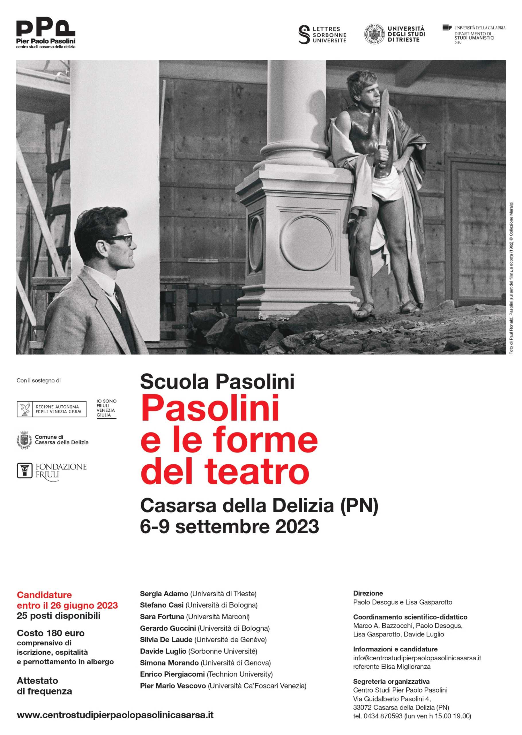 La sesta edizione della Scuola Pasolini si svolgerà a Casarsa della Delizia, nella sede del Centro Studi Pier Paolo Pasolini, dal 6 al 9 settembre 2023 e sarà dedicata a Pasolini e le forme del teatro.