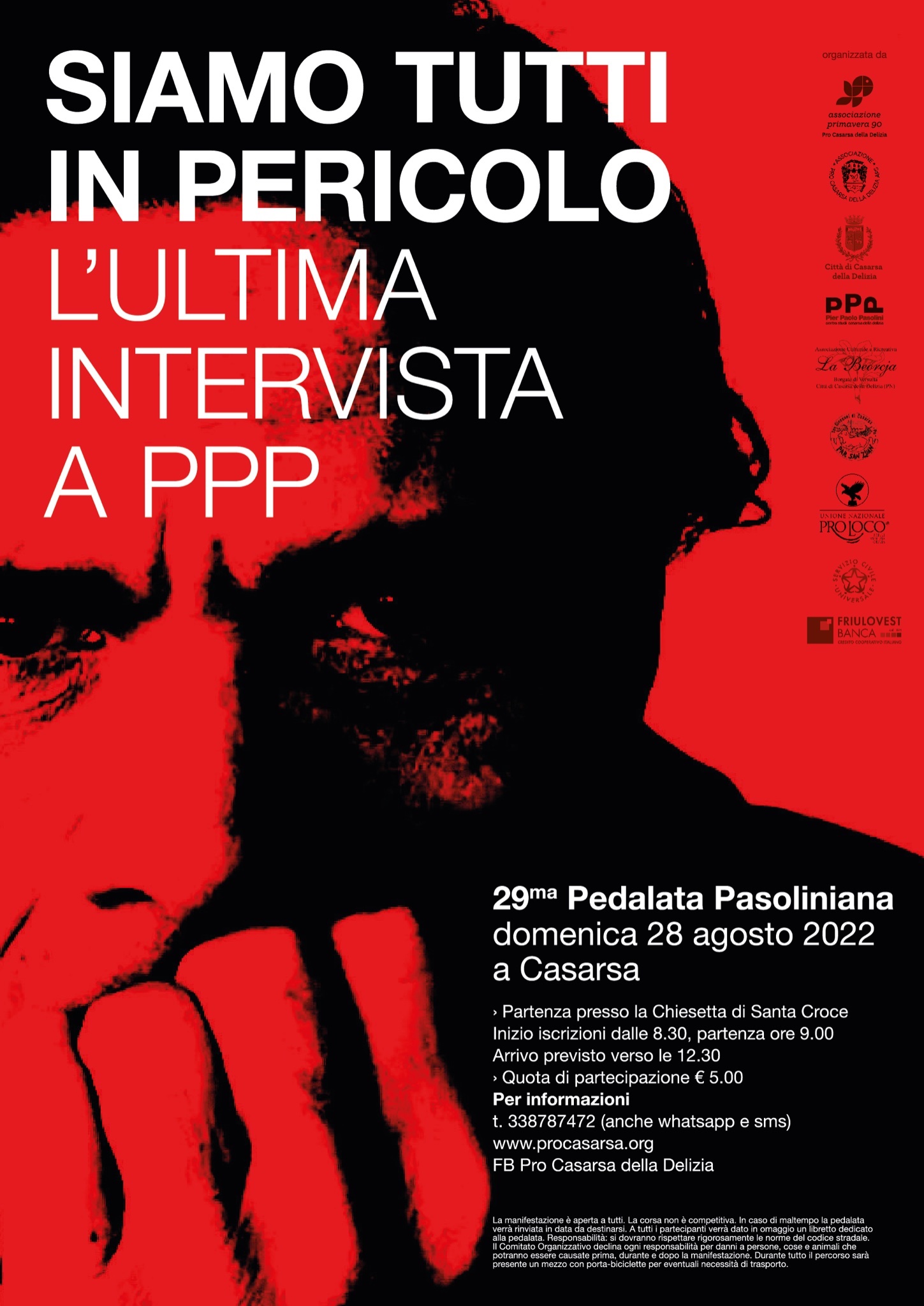 Domenica 28 agosto si terrà la 29^ edizione della Pedalata Pasoliniana, che celebrerà anche il centenario della nascita del poeta. Il profetico titolo dell’ultima intervista rilasciata da Pasolini pochi giorni prima della sua morte, “Siamo tutti in pericolo”, è stato scelto per questo tradizionale appuntamento di fine estate nei luoghi friulani della memoria dell’intellettuale, a Casarsa della Delizia e dintorni.
