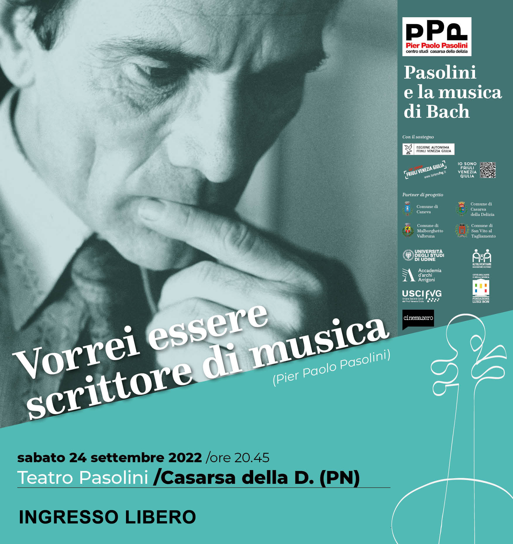 Importante appuntamento sabato 24 settembre 2022 alle ore 20.45 al Teatro Pier Paolo Pasolini di Casarsa della Delizia con il concerto “Pasolini e la musica di Bach”, inserito nel progetto “Vorrei essere scrittore di musica” e organizzato dal Centro Studi Pier Paolo Pasolini insieme all’Accademia d’Archi Arrigoni.
